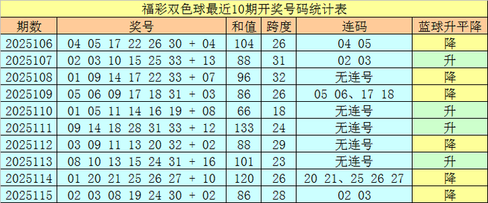 上期开奖:福彩双色球第2025115奖号开出:02 03 08 19 24 30 + 02,红球号码和值为86,首尾间距为28,包含连号:02 03。