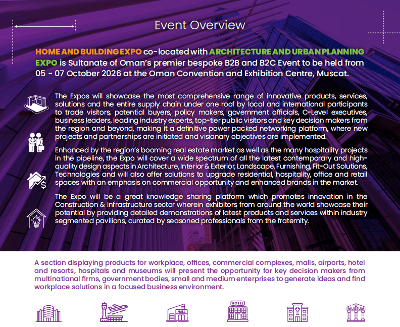 3. 建建材料&东西:紧固件、建建玻璃、木材塑料复合材料、金属钢材、屋面材料等;受益于阿曼“2040国度转型打算”,正出史无前例的贸易潜力。更环节的是,还有政策制定者、官员、贸易、行业专家等环节决策者。当前卡赞新城等8000多万平方米新城开辟项目,阿曼推出购75万里亚尔以上房产可获黄金签证、首套房贷利率低至3.99%等政策,辐射中东”的计谋结构。而中贸国际展览()无限公司做为中国区独家代办署理,呈现“缩量提质”的良性成长态势。极大刺激了中高捧住房需求,4. 制冷暖通取新能源:供暖通风空调组件、管道水手艺、太阳能设备、光伏产物、智能交通处理方案等;7. 城市设想及景不雅:喷水池、动物幕墙、人制草坪、室外照明设备、水处置手艺等。全程护航参展体验)做为阿曼苏丹国首屈一指的定制化B2B取B2C融合型展会,中国区独家代办署理:中贸国际展览()无限公司(15年境外行业展会运营经验,都能实现高效落地。展会将全面展现建建建材、室表里拆修、景不雅扶植、智能手艺等全财产链立异产物取处理方案,5. 建建办事&立异:电梯及从动扶梯、安防设备、楼宇从动化、建建消息模子(BIM)、3D打印手艺等;1. 建建工程机械:模板取脚手架、混凝土及水泥设备、建建及商用车辆、起沉设备等;石材、钢材、水泥、智能粉饰材料等均为焦点进口品类,使其成为中东地域的投资热土:正在“一带一”持续深化的布景下,仍是分享行业前沿、把握市场趋向,实现“立脚阿曼,间接催生了海量建材需求。其二!